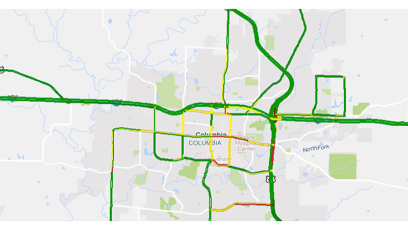 Travel time data is collected continuously via wireless technology. To assess mobility, MoDOT compares travel times during rush hour to free-flow conditions where vehicles can travel at the posted speed limit. This measure also assesses reliability, an indicator of how variable those travel times are daily.