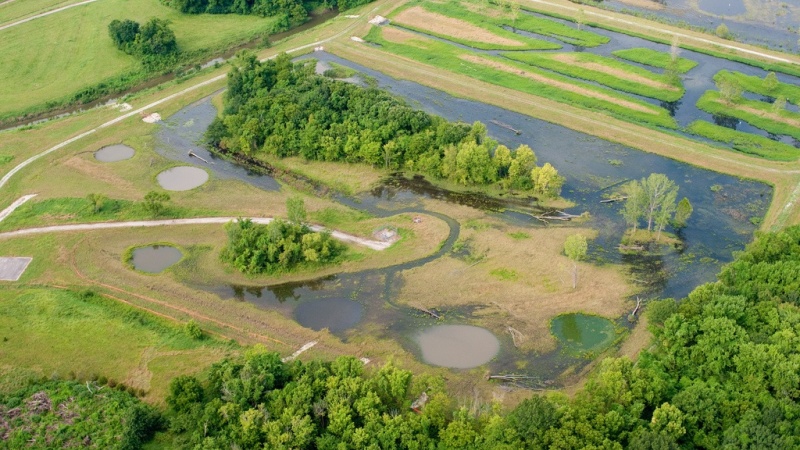 Blue Springs Bank consists of four cells containing 24 acres of emergent, scrub/shrub, and forested wetland habitat.  Some enhancements of existing wetland features at the site were also made.  The hydrology of the cells can be manipulated through the use of water inflow from the lake through piping; this allows for greater management of water in and through the system to better achieve targeted restoration goals.  This site is accessible to the public for bird and wildlife observation.